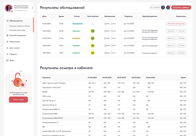 - Диагностика доступна онлайн и очно — всё результаты доступны в личном кабинете, а при повторном визите — в динамике.